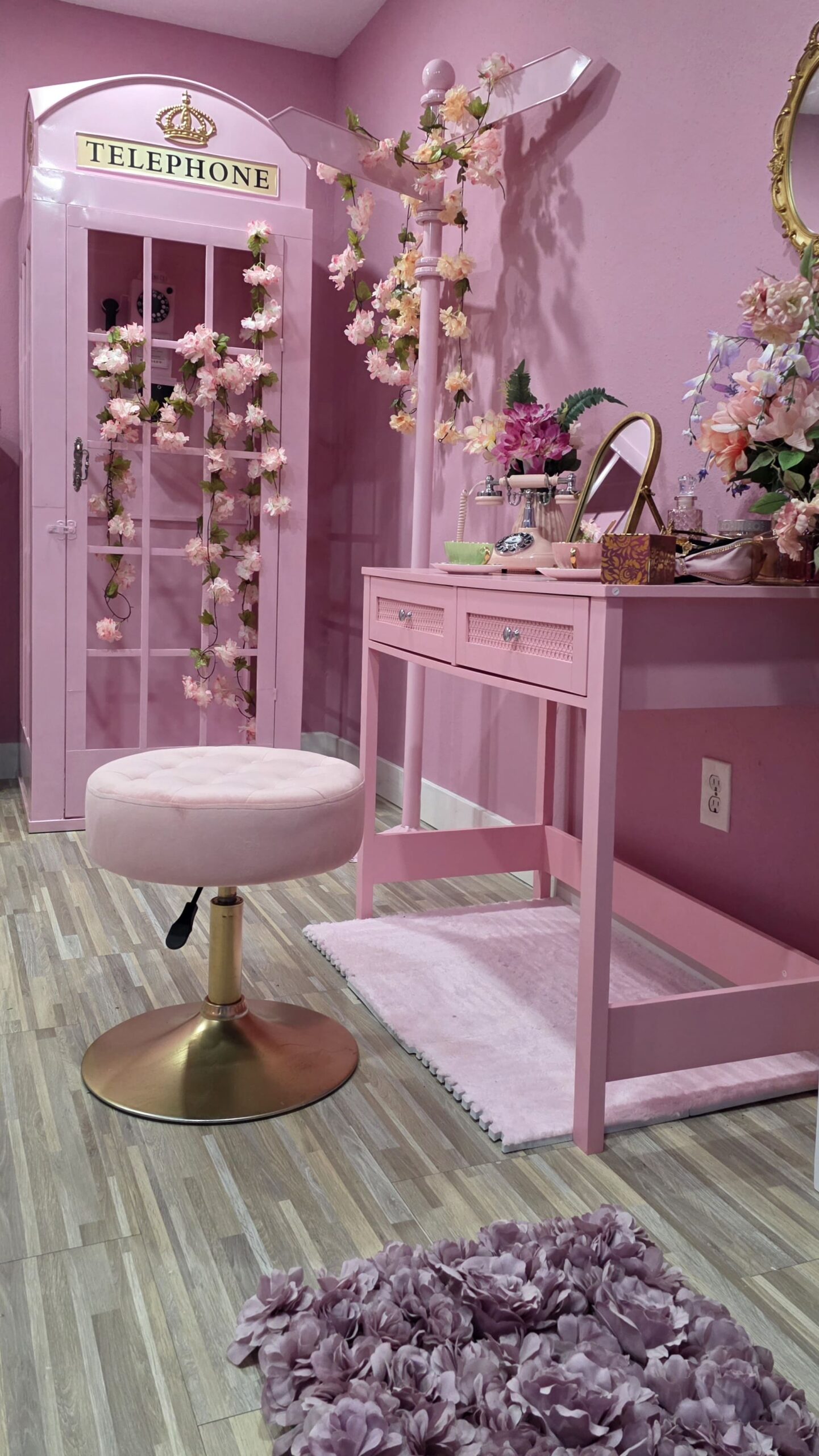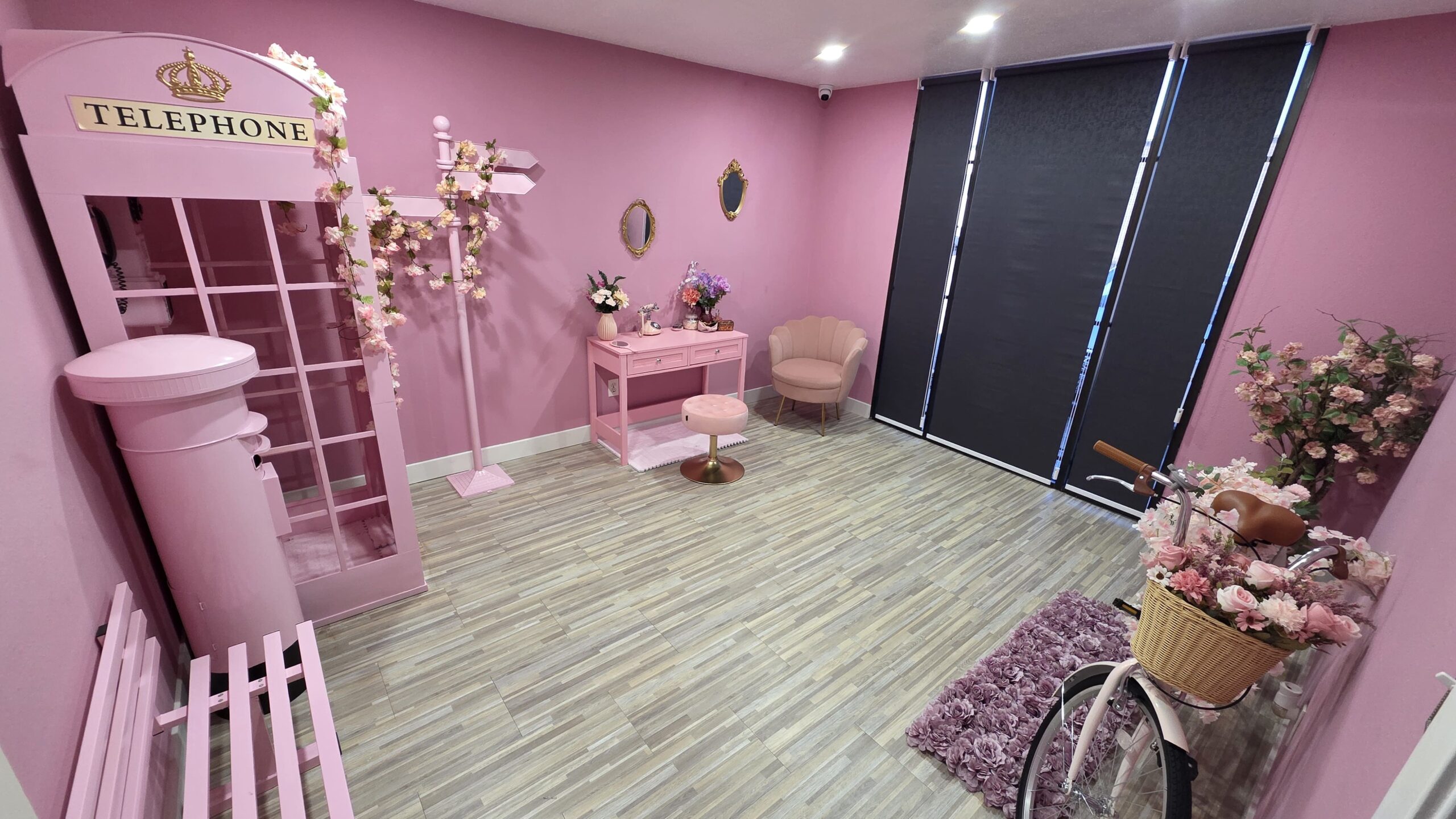 - A playful and chic setting featuring a pink London-style telephone booth, a vanity makeup desk with stool, a pink bench with coordinated props, and a pastel pink bicycle. Everything is arranged to create fun, whimsical, and visually stunning photo opportunities.